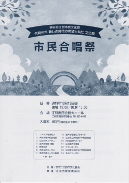 第66回 江別市民文化祭 2019 市民合唱祭 日時 2019年10月13日(日) 開場 13:00/開演 13:30 会場 江別市民会館大ホール 入場料 500円(高校生以下無料) 主催/特定非営利活動法人 江別市文化協会 共催/江別市教育委員会  第65回 江別市民文化祭 2018 市民合唱祭 日時 2018年10月14日(日) 開場 13:00/開演 13:30 会場 江別市民会館大ホール 入場料 500円(高校生以下無料) 主催/特定非営利活動法人 江別市文化協会 共催/江別市教育委員会 江別市文化協会 創立50周年記念 第62回 江別市民文化祭 2015 市民合唱祭 日付/2015年10月11日(日) 会場/江別市民会館大ホール 主催/特定非営利活動法人 江別市文化協会 江別市制施行60周年記念 第61回 江別市民文化祭 2014 市民合唱祭 平成26年10月12日(日) 会場 江別市民会 | |